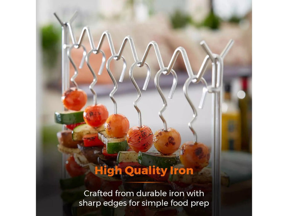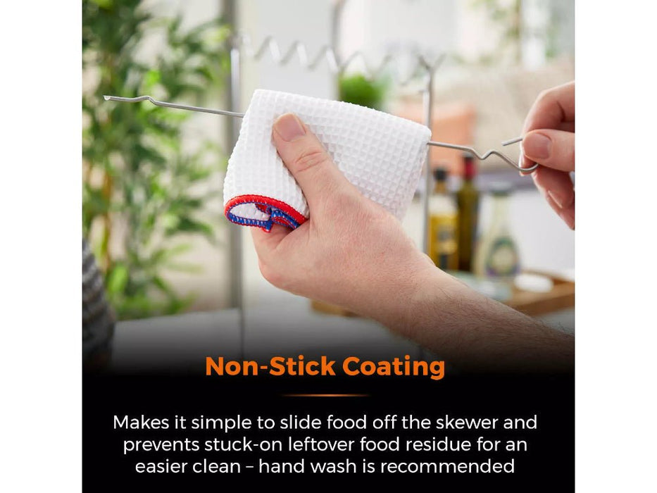 NON-STICK COATING - Makes it easy to release the food from the skewer with the additional help of an included fork, and prevents stuck-on leftover food residue for an even easier clean after use – hand wash is recommended to keep skewers and stand at their best.