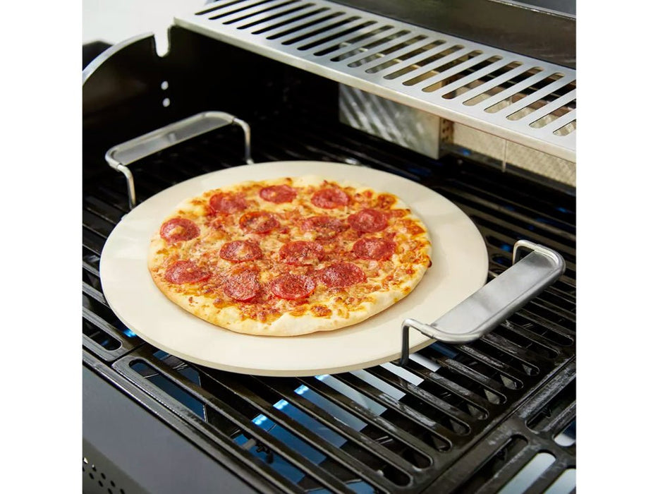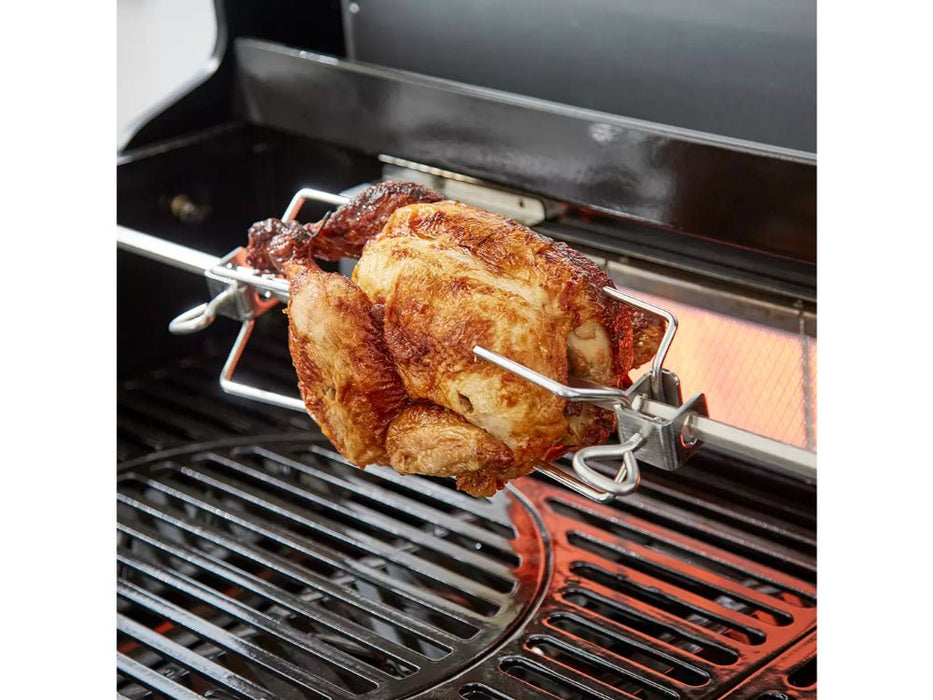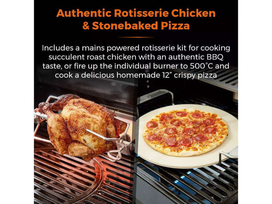 Authentic Rotisserie Chicken & Stonebacked Pizza – Includes an easy set-up mains powered rotisserie kit that rotates for cooking succulent roast chicken with an authentic BBQ taste. Fire up the individual burner to 500°C and cook a delicious homemade crispy pizza on the 35cm grill plate or on the pizza stone – perfect for a 12” pizza. The main BBQ lid locks in the heat and intense BBQ flavours.