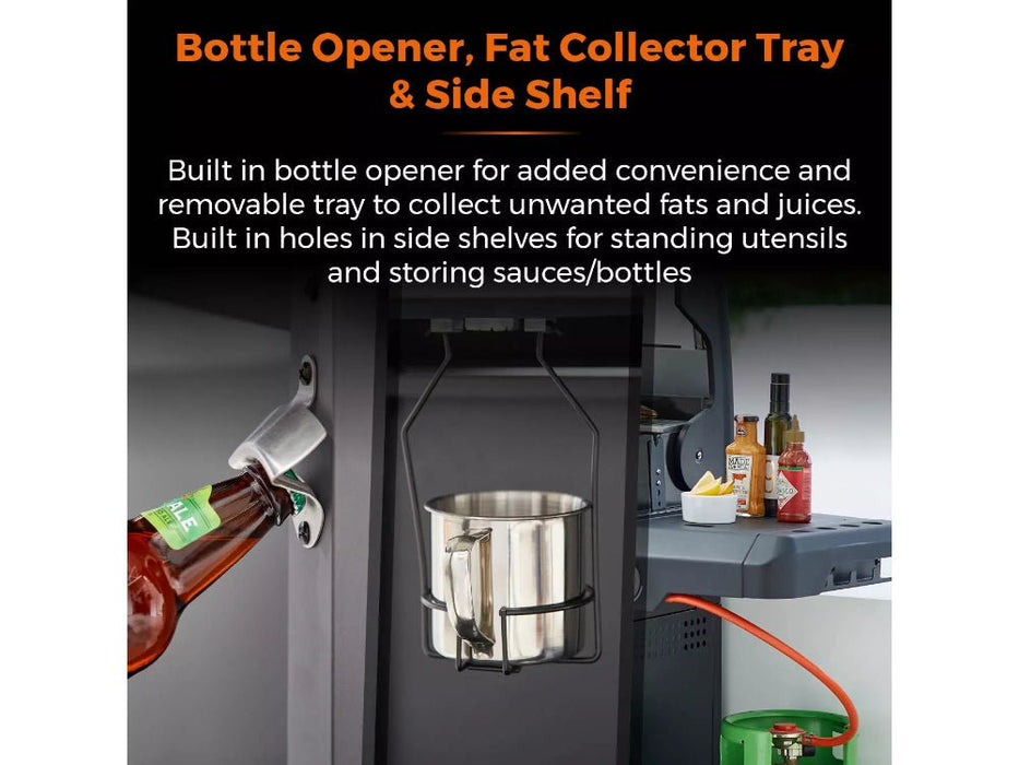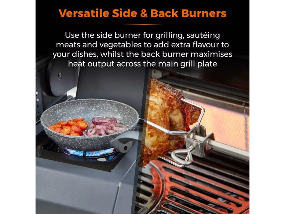 Versatile Side & Back Burner – The multi-function side burner provides extra cooking space for grilling, sautéing meats and vegetables to add extra flavour to your dishes or crisp up burger toppings, whilst the individually-controlled back burner maximises heat output across the main grill plate