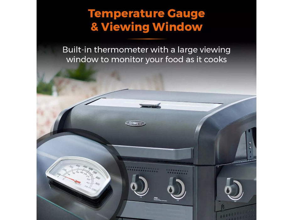 Temperature Gauge & Viewing Window - Built-in thermometer allows you to grill your BBQ favourites at the ideal temperature for efficient cooking results, with a large viewing window to monitor the progress