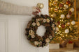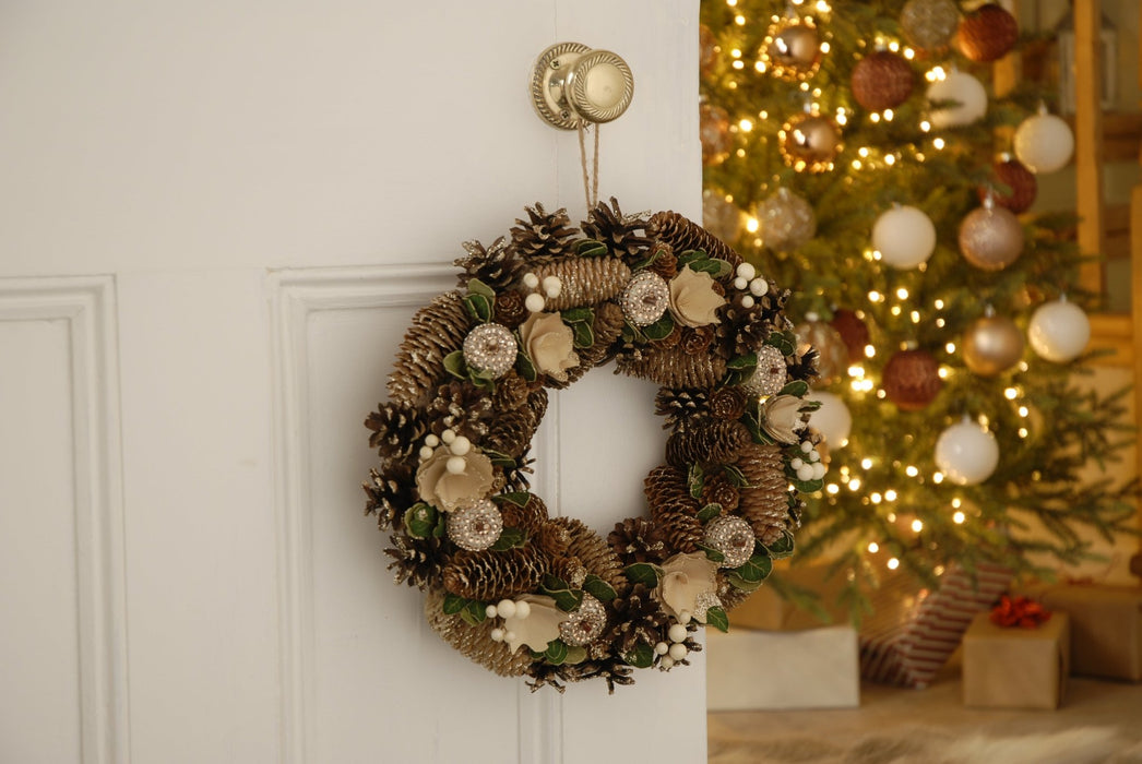 - Wreath with green leaves, gold glittered pinecones and gold tipped roses