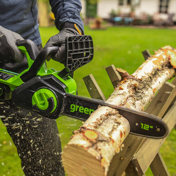 The Greenworks GD24CS30 cordless chainsaw is perfectly suited for cutting firewood thanks to its lightweight and compact design. Power comes from an advanced 24V battery, which is interchangeable with all 24V Greenworks tools.