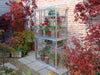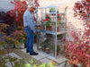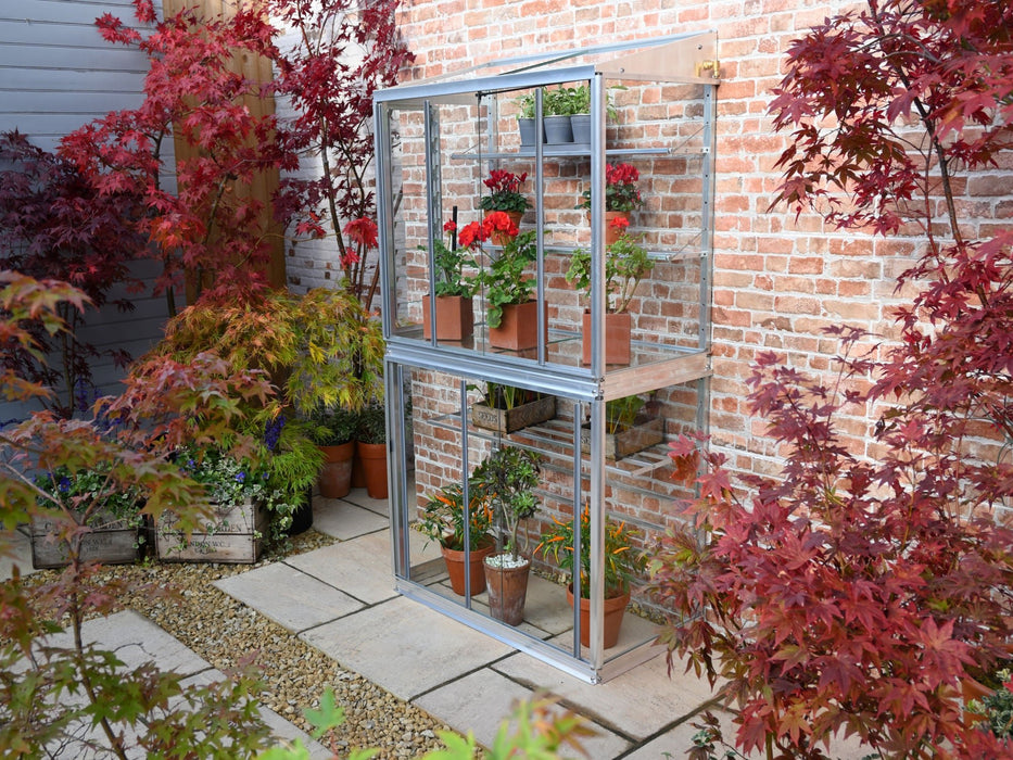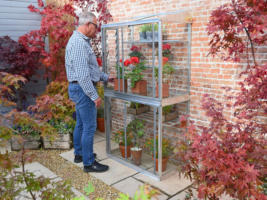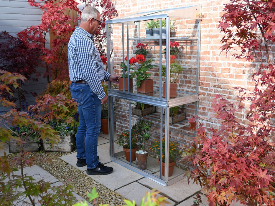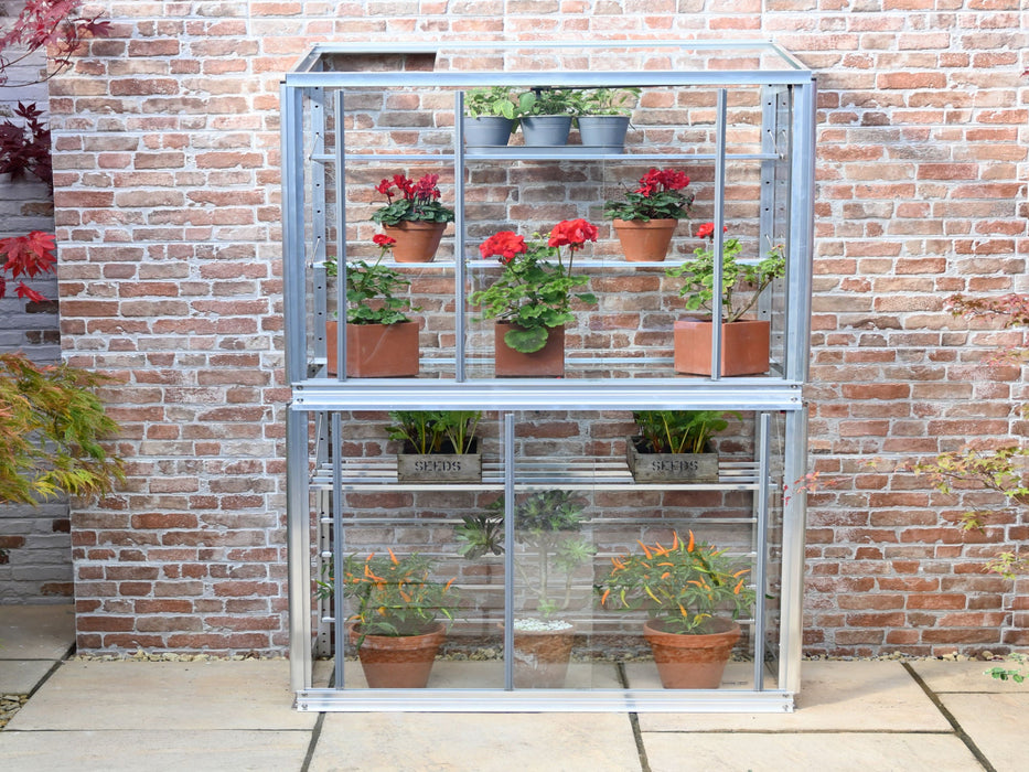 The mini greenhouse includes 2 narrow and 2 deep seed tray shelves, which can be adjusted for height and can be removed or dropped flat when not required in summer. Strong but slim aluminium bars reduce shading of the plants below. The toughened glass centre staging lets light down to the lower level and is rated to 25kg per sheet. The staging can be removed in summer for taller crops.
