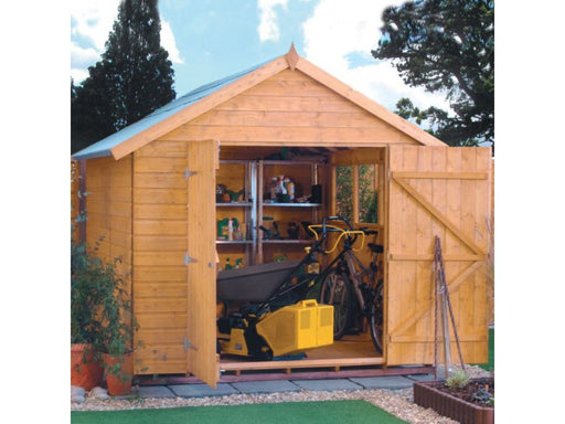 Apex Style Roof Single Door Good Internal Height Vertically Clad with Prime Garde 12mm, European Kiln-Dried T&G Timber with a Fine Sawn Finis...