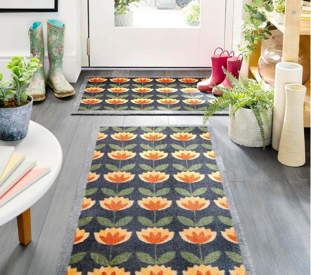 My Mat is the ideal all-purpose indoor mat or runner, that is highly effective at keeping your floors clean. My Mat Nylon Retro Floral features a repeating floral design, in shades of orange and yellow on a navy background, with a light grey border. This range of brilliant designs and sizes provides easy cleaning and drying properties. With natural stain resistance, My Mats maintain freshness after continuous washes and uses. Traps dirt, dust & mud to protect your flooring and washable at 30°C.